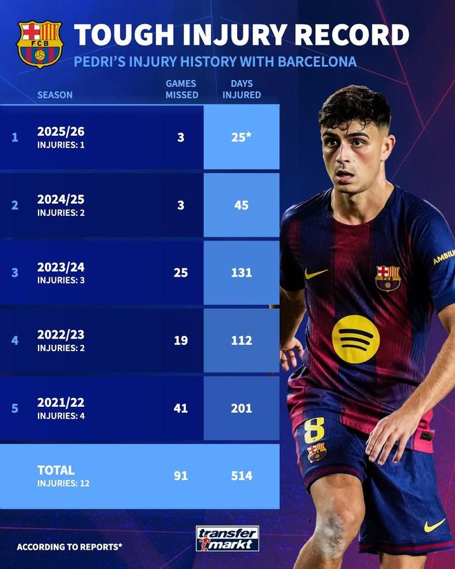 佩德里遭遇加盟巴萨后第12次受伤,总伤缺时间或达514天